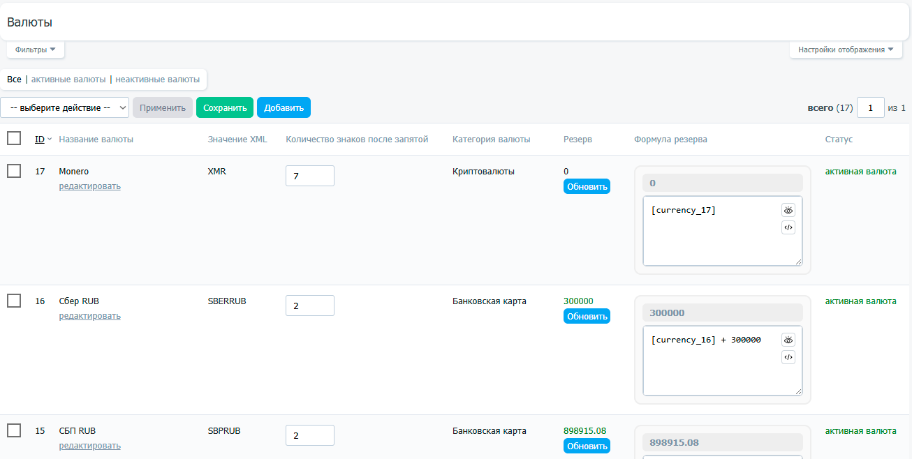 Из общего списка, валюту можно просмотреть или удалить, активировать или деактивировать.