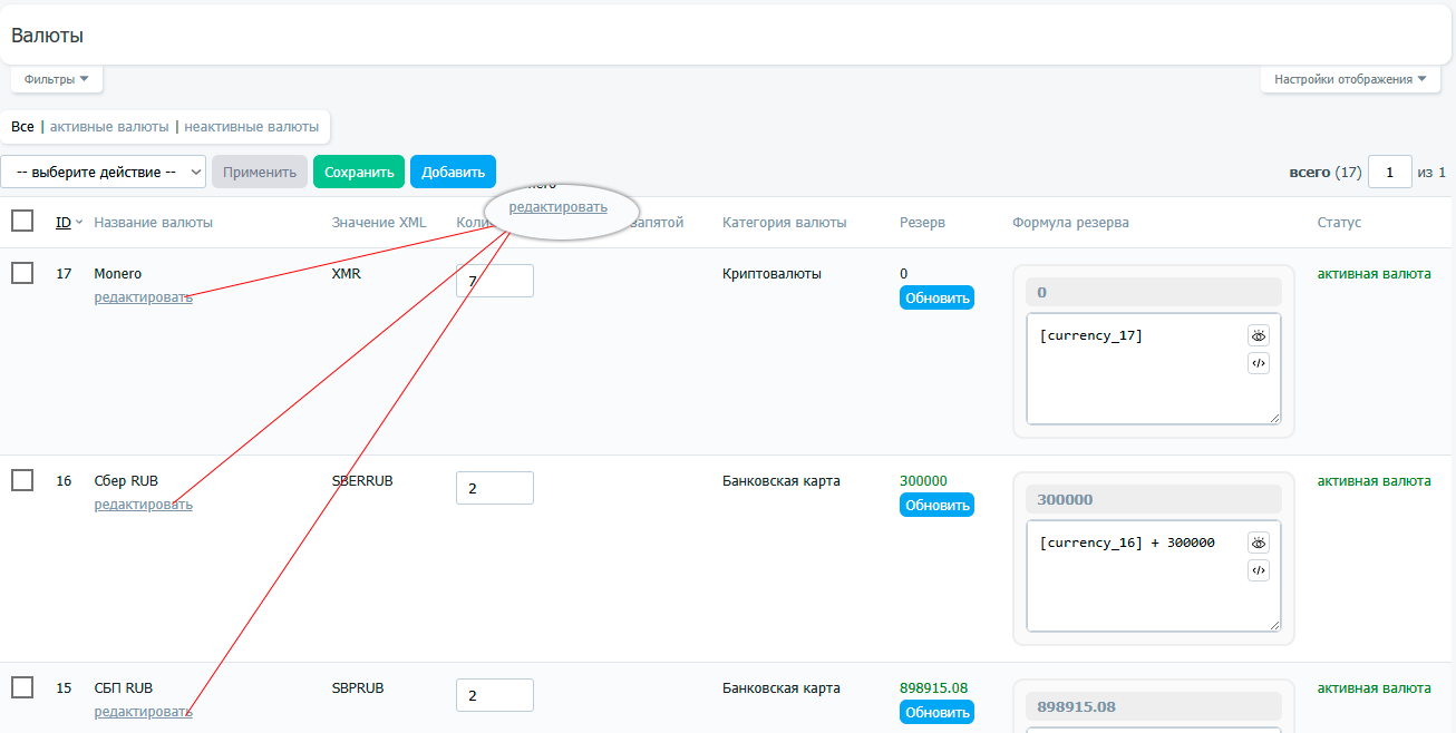 Для редактирования валюты, в списке необходимо нажать кнопку "редактировать"