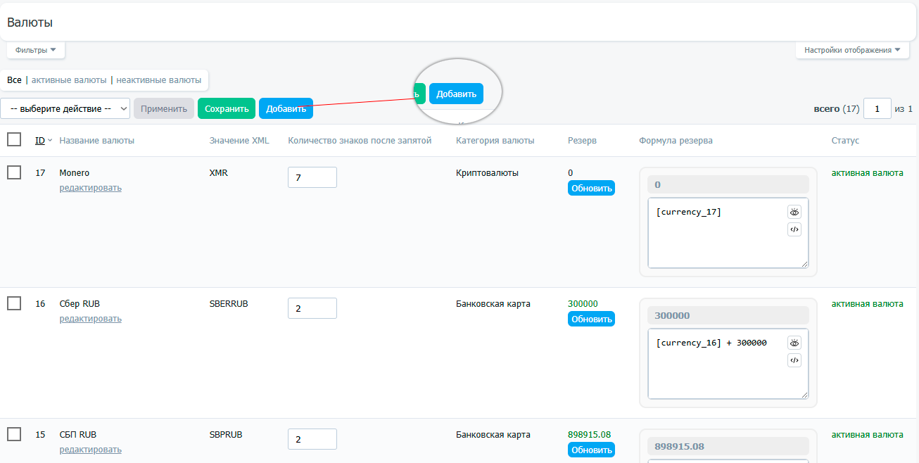 Для добавления валюты, из общего списка можно нажать кнопку "Добавить"