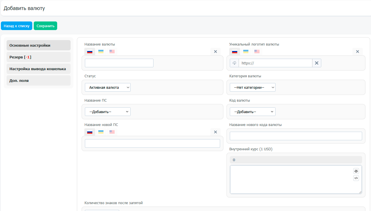 При добавлении и редактировании валют, существует следующие вкладки и поля: