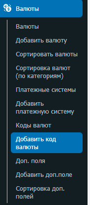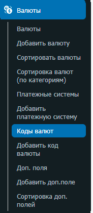 Для добавления кода валюты, из общего списка можно нажать кнопку "Добавить"