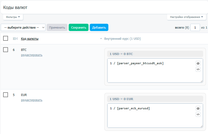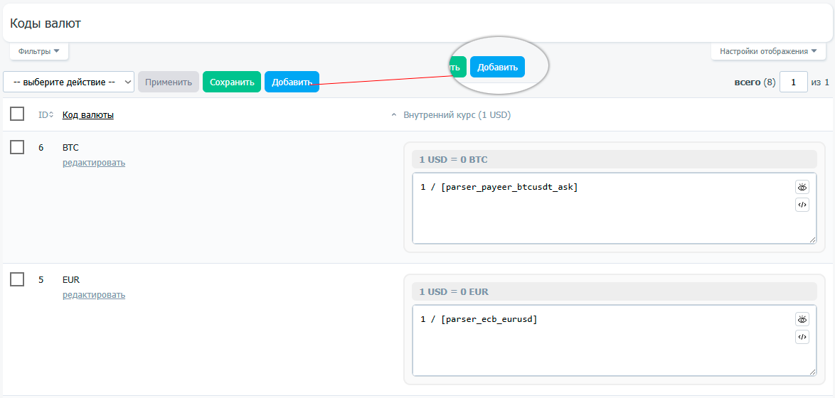 Для редактирования кода валюты, в списке необходимо нажать кнопку "редактировать"