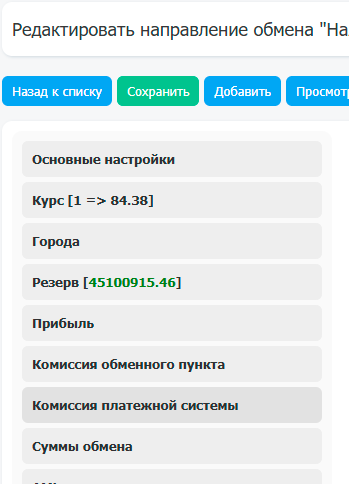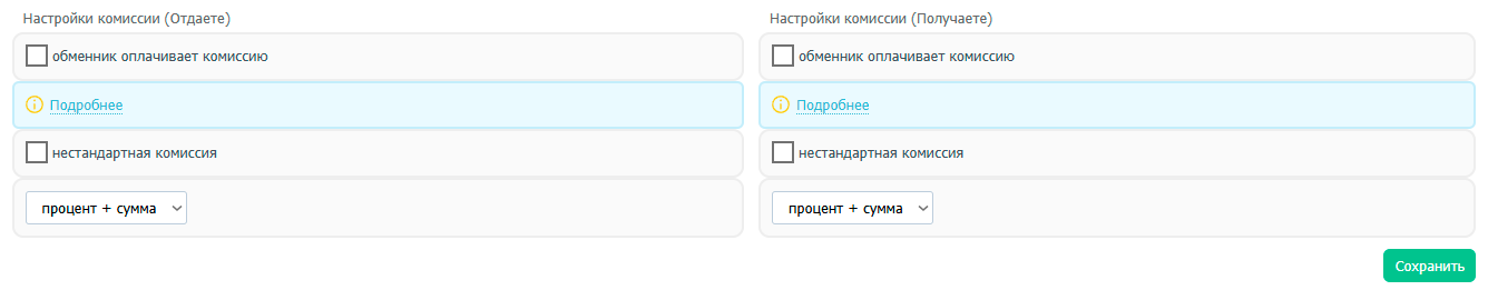 При активации плагина, при редактировании обмена, в соответствующих вкладках "Комиссия обменного пункта" и "Комиссия платежной системы"