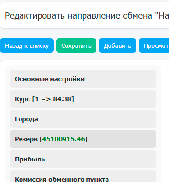 При активации, плагин создает дополнительные настройки в направлениях обменов, на вкладке "Резерв" если активирован плагин "Резерв направления обмена"