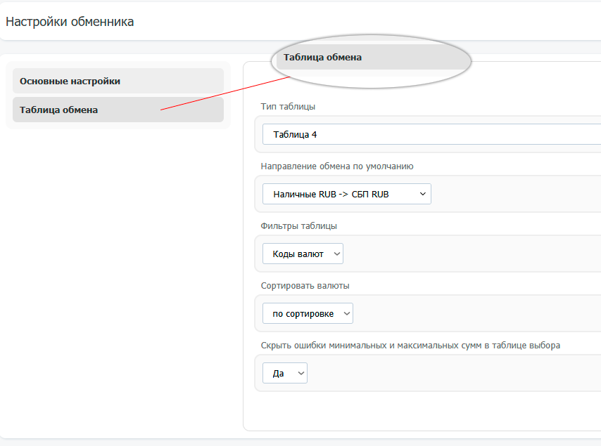 Настройки таблицы обмена, находятся разделе "Настройки" - "Настройки обменника".