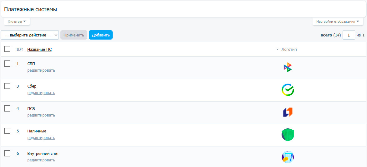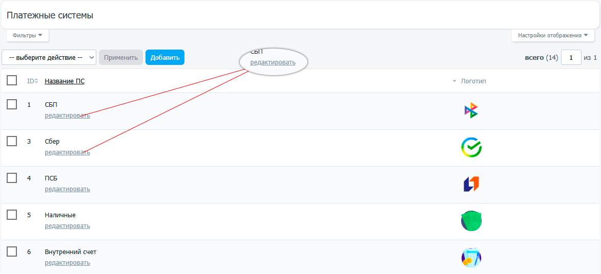 Для редактирования платежной системы, в списке необходимо нажать кнопку "редактировать"
