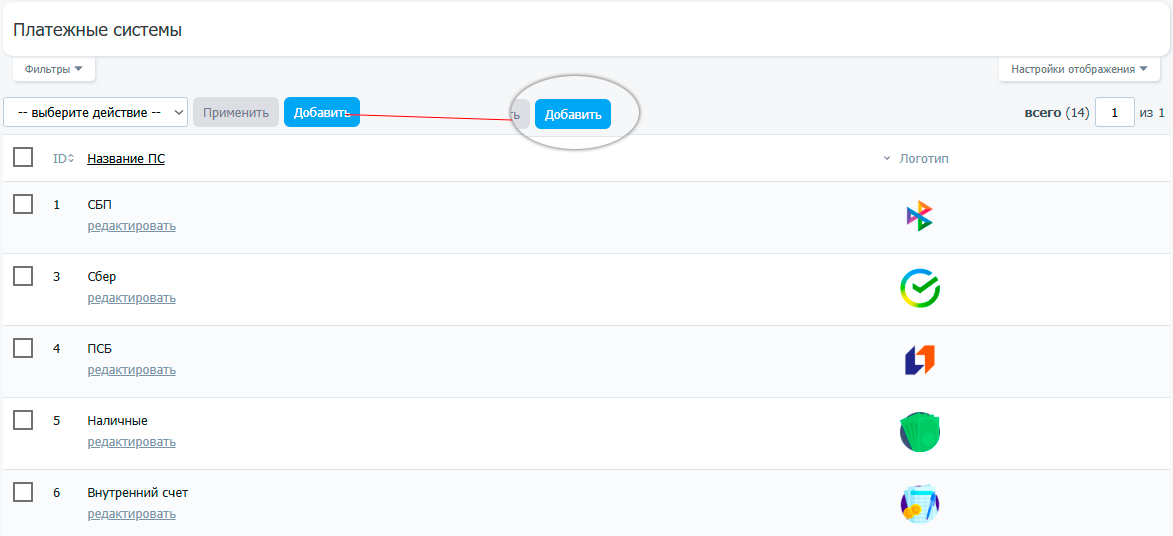 Для добавления платежной системы, из общего списка можно нажать кнопку "Добавить"